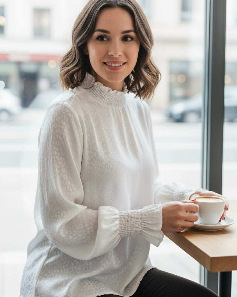 The top is a white blouse with a high, ruffled, and smocked neckline. It features long, voluminous sleeves with matching smocked and ruffled cuffs, made with 100% polyester