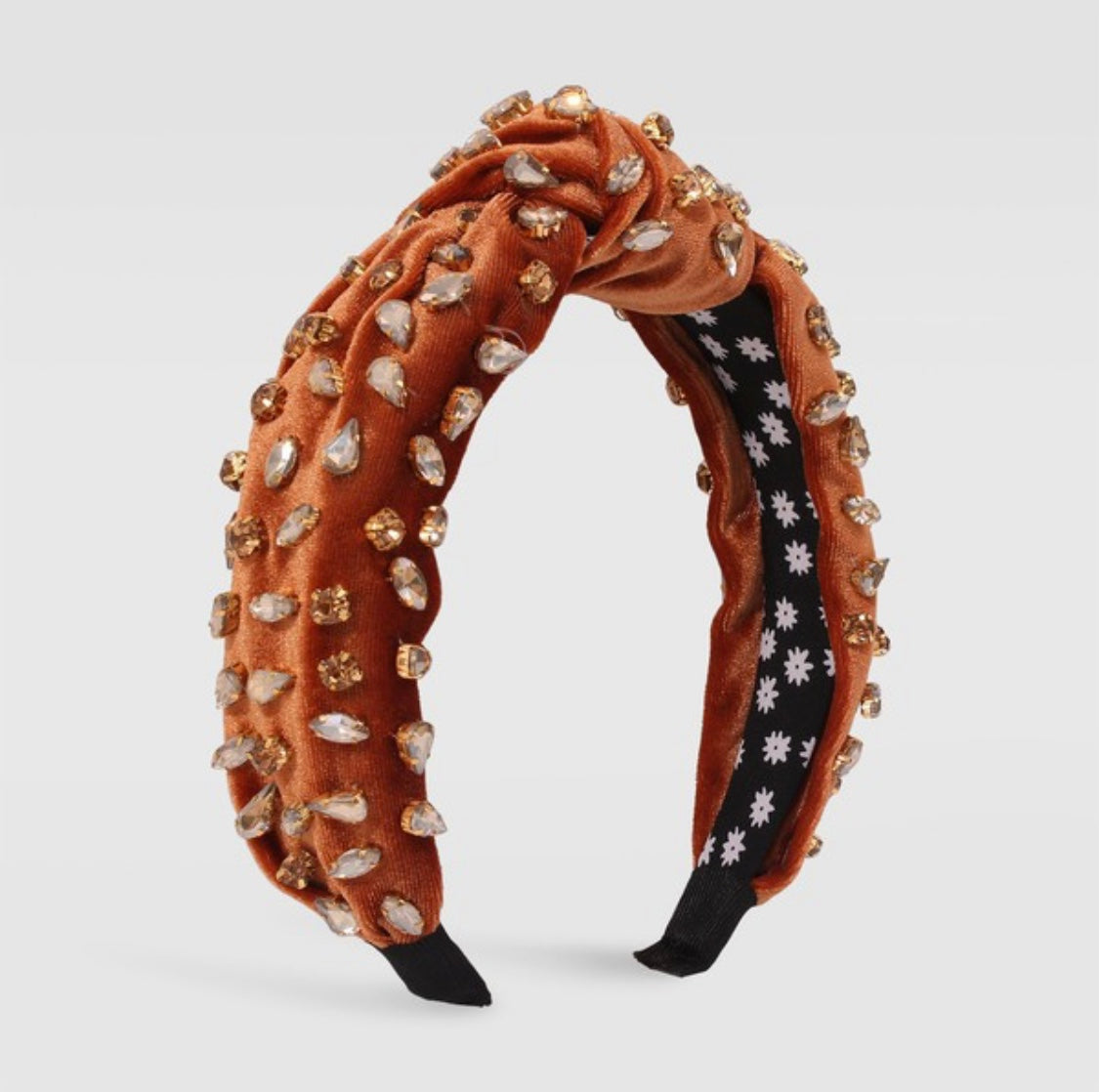 velvet knotted headband adorned with rhinestonesEncrusted with numerous rhinestones, providing sparkle and visual interest