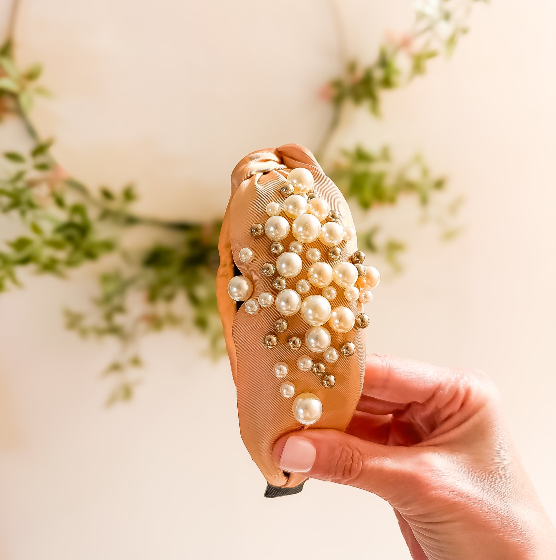 Discover your inner elegance with this breathtaking satin blush pink Elegant Pearl Knotted Headband.