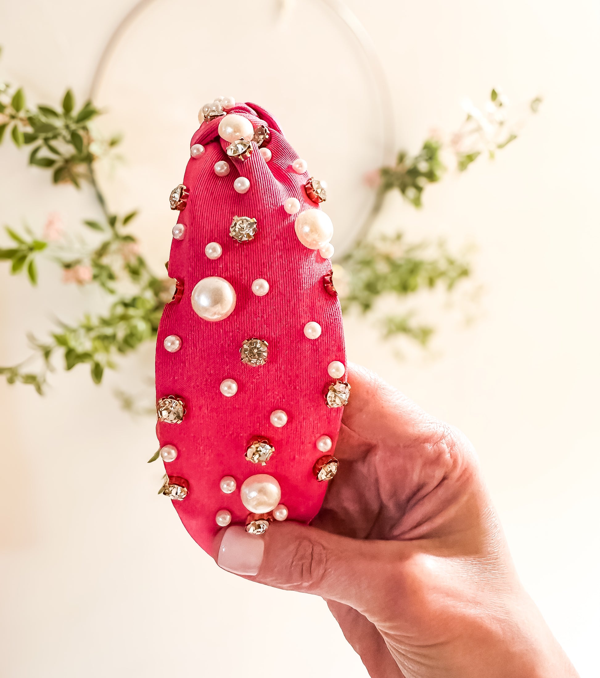 Elevate your style with this vibrant pink jewel headband, adorned with touches of gold and pearls, perfect for adding a confident pop of glamour to any outfit.