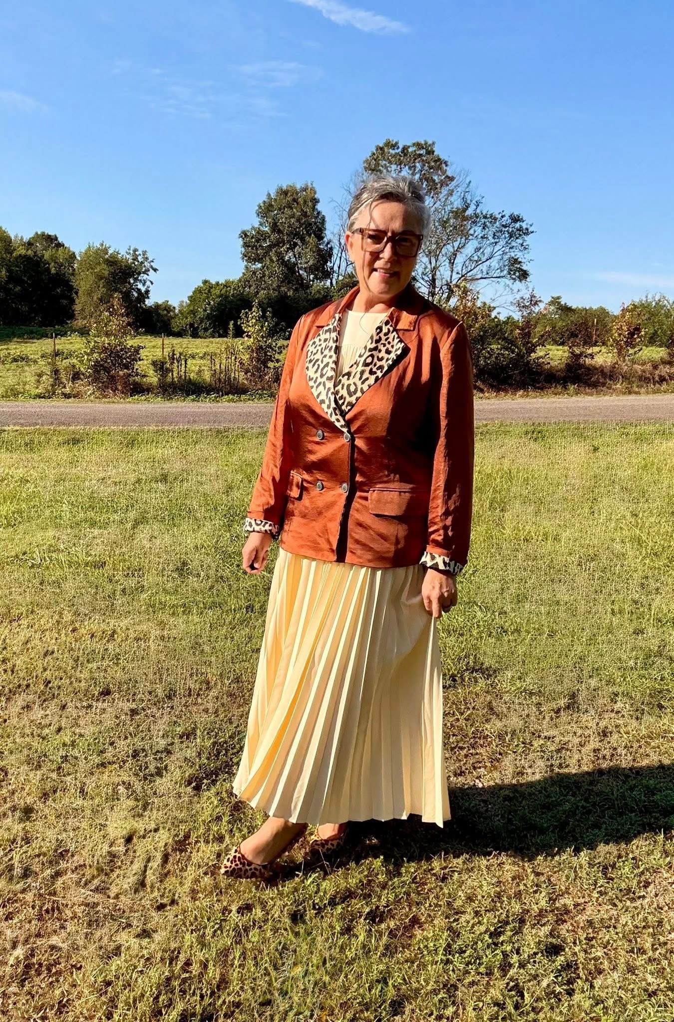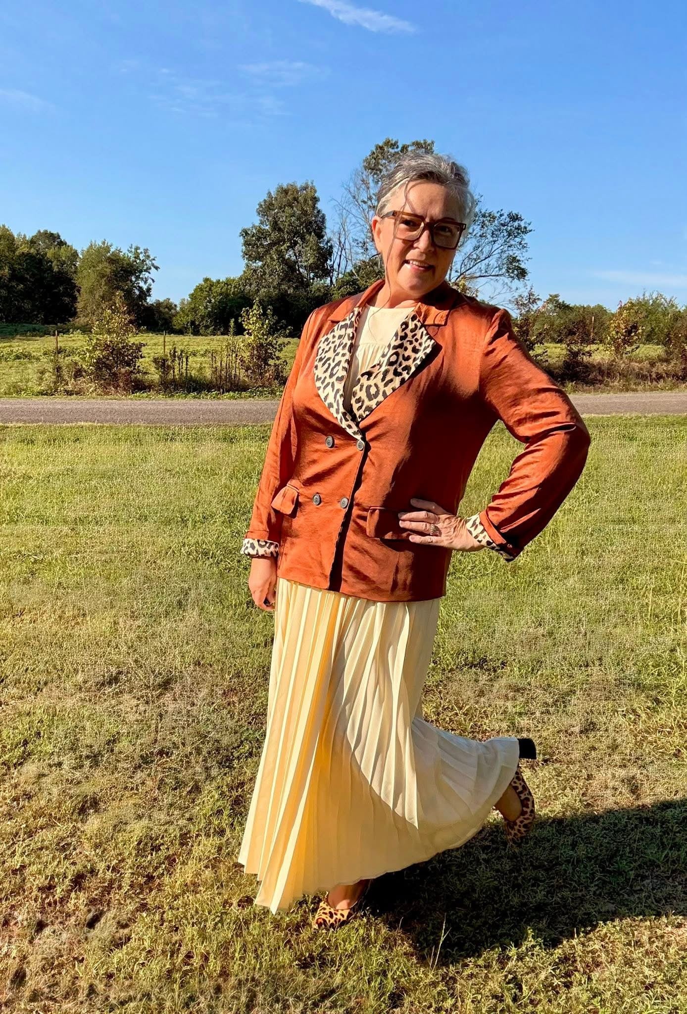 Solid satin blazer with leopard print lined details inside body, long sleeves, and front flap pockets.